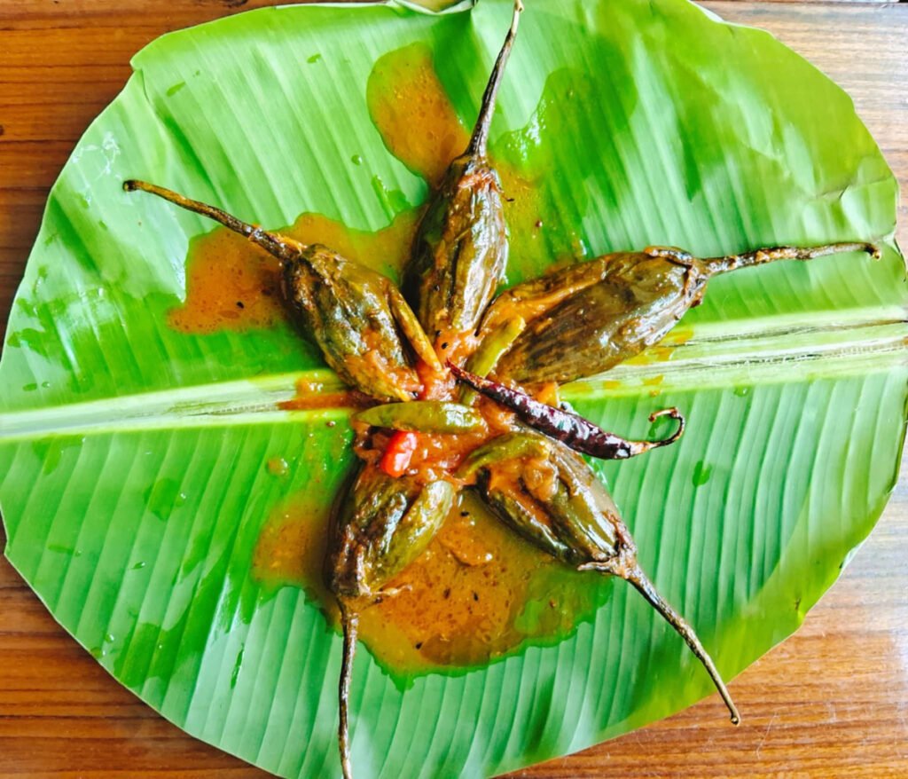 উপকরণ : ছোট সাইজের বেগুন চারটে, পেঁয়াজকুচি, পাঁচফোড়ন, আদারসুন বাটা, হলুদগুঁড়ো, লঙ্কারগুঁড়ো, নুন, চিনি, পাকা তেঁতুলের পাল্প, তেজপাতা, ছোট এলাচের গুঁড়ো, কয়েকটা আস্ত কাঁচালঙ্কা, দুটো শুকনোলঙ্কা।