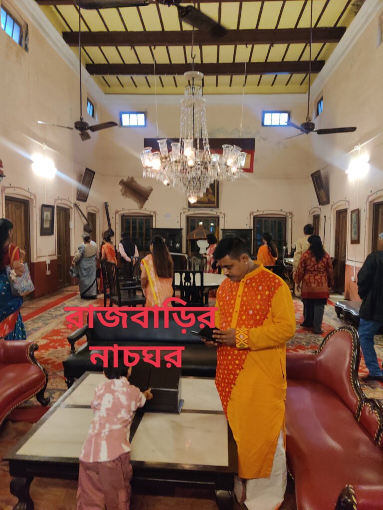 এই বাড়ির আনাচকানাচে লুকিয়ে আছে ইতিহাস। বাইরের অংশে রয়েছে কাছারিবাড়ি, হিসেবের ঘর। ভিতরে অন্দরমহল। সেখান থেকে বাইরেটা দেখা গেলেও বাইরে থেকে ভেতরটা দেখা যায় না। এমনকি ছাদেও রয়েছে উঁচু পাঁচিল। মেয়েরা ছাদে উঠলে বাইরে থেকে কেউ তা দেখতে যাতে না পায় সেইজন্য। গাইডের সঙ্গে ছাদে গেলাম। সিঁড়ির মুখে লেখা ‘স্বপ্নের সিঁড়ি’। এই রাজবাড়িটি প্রথাগত বাঙালি এবং ঔপনিবেশিক শৈলীর সংমিশ্রণে তৈরি। এখানে পর্যটকদের থাকার জন্য রয়েছে রাজকীয় ঘর ও খাবারের ব্যবস্থা। গাইড আমাদের ঘোরাতে ঘোরাতে নিয়ে গেল নাচঘরে। নাচঘর আগের মত সজ্জিত নেই যদিও ‘হাজারটাকার ঝাড়বাতিটা’ যেটা রাতটাকে দিন করে দিত, সেটি আজও স্বমহিমায় ঝুলে রয়েছে ছাদ থেকে। রয়েছে বেশ কিছু বাদ্যযন্ত্র ঘরের বিভিন্ন কোণায়। চোখ বুজে সেই আসরটার কথা চিন্তা করতেই যেন শুনতে পেলাম নুপুরের আওয়াজ, তবলায় চাঁটি। চোখ খুলে বাস্তবে এলাম। সত্যি রাজারাজড়ারা তখন জীবন কাটিয়েছে বটে। নাচঘরের পাশের একটি ছোট ঘরে রাখা রয়েছে তৎকালীন রাজবাড়ির রসুইখানায় ব্যবহৃত বিশাল বড় বড় বাসন। একসঙ্গে কয়েকশো লোকের রান্না করার মত কড়াই, হাঁড়ি, গামলা, হাতা-খুন্তি, হামানদিস্তা। সেগুলো নিশ্চয়ই তখন রসুইঘর বা তার পাশের কোনো ঘরে থাকতো, বর্তমানে সেগুলি নাচঘরের পাশে স্থান পেয়েছে। আবার নাচঘর যখন রয়েছে গুমঘর তো থাকবেই। যেসব সৌভাগ্যবতী মহিলা রাজার বিশেষ কৃপাধন্য হয়ে রাজার সান্নিধ্য লাভ করেছিল, তাদেরই দেহে প্রাণের সঞ্চার টের পেলেই তার স্থান হতো গুমঘরে। খাল্লাস। সেই গুমঘরটির মধ্যেকার কুয়া বুজিয়ে সেটি বর্তমানের চা-ঘর হয়েছে। তার পাশ দিয়ে এগিয়ে ছিল তখনকার আস্তাবল। ৩০০ ঘোড়া থাকতো সেখানে। সন্ধে ৬টায় একটু অন্ধকার হতেই শুরু হল নাটমন্দিরে পুজো। সৌম্যকান্তি বৃদ্ধ পুরোহিতমশাই পট্টবস্ত্র পরিধান করে উপস্থিত। শ্রী শ্রীধর জিউয়ের মূর্তি রয়েছে সেখানে। পুরোহিতমশাই পুজো করলেন, শেষে আরতি হল, তার সঙ্গে বাজনা বাজল। খোল, করতাল, ঘড়ি, ঘন্টা — অপূর্ব এক পরিবেশ।
