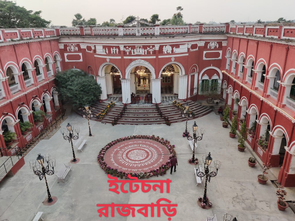 অতরকম পদ, খাওয়াটা বেশিই হয়ে গেল। খেয়েদেয়ে আমরা রাজবাড়ির উল্টোদিকের শিবমন্দিরে গেলাম। দেবাদিদেব মহাদেব ও তাঁর ষাঁড় রয়েছে সেই মন্দিরে। কুন্দ্রাদের আরাধ্য দেবতা কিন্তু নিজেদের ওই অঞ্চলে প্রতিষ্ঠিত করার জন্য জনতার দাবী মেনে তাদের বৈষ্ণব-ধর্ম গ্রহণ করতে হয়েছিল। রাজবাড়ির মন্দিরে তাই শ্রী শ্রীধর জিউকে প্রতিষ্ঠিত করতে হয়েছিল আর মহাদেবের স্থান হয়েছিল রাজবাড়ির চৌহদ্দির বাইরে। আমরা মহাদেবকে প্রণাম করে ভেতরে ঢুকলাম। এরপর ওপরে গেলাম একটু শুতে কিন্তু মিনিট ২০ পরেই ডাক এল। ৪টে থেকে গাইড রাজবাড়ি ঘুরিয়ে দেখাবে তেমনই কথা ছিল। যারা সেদিন রাজবাড়িতে আতিথ্য গ্রহণ করেছিলেন সবাই গিয়ে হাজির হলেন ঠাকুরদালানের সামনে। শুরু হল গাইডের বক্তৃতা। অব আয়েগা মজা। গাইড তো রাজবাড়ির ইতিহাস শুরু করল। এরা কোথায় থাকতেন, কোথা থেকে এলেন, কতদিন আগে তারা এখানে এসে থাকতে শুরু করেন। গাইডের বলার ভঙ্গি ও ভুলভাল ইংরেজি মিশ্রিত কথা সবাইকে বেশ মজা দিচ্ছিল। আমরা সবাই বেশ উপভোগ করতে লাগলাম। ওদিকে ‘সি করুন’, ‘লুক করুন’ শুনে সবাই হাসছি আমরা। হঠাৎ চিৎকার করে ‘ফলো মি’ করে এগোতে শুরু করলে আমরা তাকে ফলো করতে লাগলাম। আমরাও তার সঙ্গে মজা করছিলাম কিন্তু তাতে সে মোটেই বিরক্ত নয় বরং মনে হচ্ছিল সে-ও বেশ উপভোগ করছে। স্থানীয়রা এই জায়গাটিকে বর্গীডাঙা বলে থাকে। ঐতিহাসিক মতে, এককালে বাংলা আক্রমণকারী মারাঠা লুন্ঠনকারীরা বাংলায় এসে লুন্ঠন ও ধ্বংসযজ্ঞ চালাত। তাদের স্থানীয়ভাবে বর্গী বলা হত। বাংলার মানুষ তাদের ভয়ে সদা তটস্থ হয়ে থাকত। মহিলারা দুপুরে বাচ্চাদের ঘুম পাড়াবার সময় ভয় দেখিয়ে গান জুড়ে দিত, “খোকা ঘুমালো, পাড়া জুড়ালো, বর্গী এল দেশে, বুলবুলিতে ধান খেয়েছে খাজনা দেবো কিসে?” এইধরনের অনেক বর্গী এখানে বসতি স্থাপন করেছিল, তাই একে বর্গীডাঙা বলা হয়। ইটেচনা রাজবাড়ির ইতিহাস জড়িয়ে রয়েছে এই বর্গীডাঙার সঙ্গে। বর্গীর দল বারবার বাংলা আক্রমণ করত চৌথ আদায়ের জন্য অর্থাৎ তারা পরাজিত জনগণের কাছ থেকে কর হিসাবে ফসলের এক-চতুর্থাংশ বা তার সম-মূল্য আদায় করত। ধনসম্পত্তি আদায় করে আবার ফিরে যেত নিজ দেশে। এইধরনের অনেক বর্গী তাদের জন্মভূমিতে ফিরে যাওয়ার পরিবর্তে স্থায়ীভাবে বসবাস করতে শুরু করে এই বঙ্গদেশে। তারই একটি উদাহরণ এই ইটেচনা রাজবাড়ি। এটির প্রতিষ্ঠাতা ছিলেন কুন্দ্রারা। এই কুন্দ্রা থেকেই পরে কুন্ডু পদবী এসেছে। শৈব্য হওয়া সত্ত্বেও বৈষ্ণব ধর্মে ধর্মান্তরিত হয়ে কুন্ডু উপাধি গ্রহণ করেছিলেন এবং স্থানীয় জমিদার হয়েছিলেন। রাজবাড়িটি ১৭৬৬ খৃষ্টাব্দে শ্রী সফল্য নারায়ণ কুন্ডু দ্বারা নির্মিত হয়েছিল। ২০১২ সালে কুন্ডুদের ১৪তম প্রজন্ম দ্বারা এটিকে বর্তমান রূপে সংস্