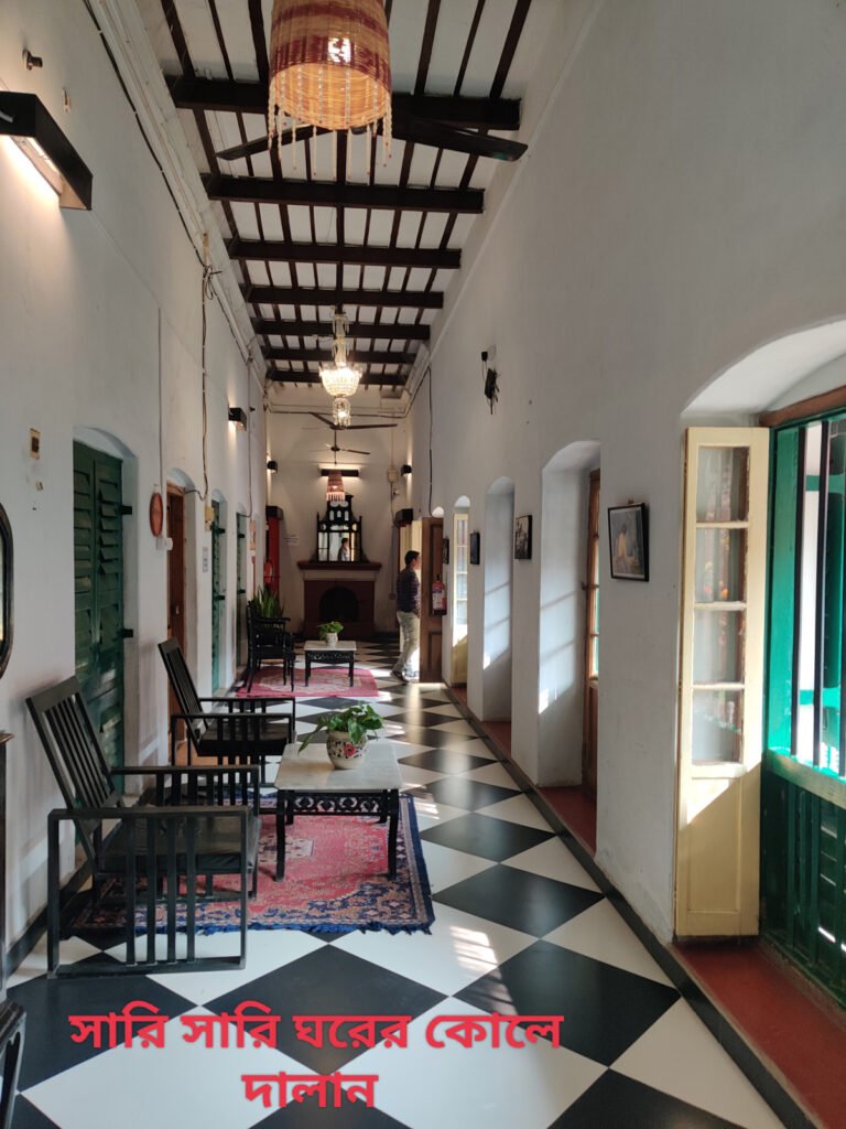 বর্তমান রাজবাড়ির সদস্যরা নিজেদের ব্যবহারের জন্য কিছু অংশ রেখে বাকীটা এক কর্পোরেট সংস্থাকে দিয়ে দিয়েছেন। ওই বিশাল এলাকা জুড়ে তিনমহলা বাড়ি নিজেরা দেখাশোনা করা বড় সহজ ব্যাপার নয়। তাই এ ব্যবস্থা। বিশেষত বাড়ির পরের জেনারেশনের প্রায় সবাই বাংলার বাইরে রুজিরোজগারের সন্ধানে। এছাড়া ঐতিহাসিক সম্পত্তিগুলোকে পুরাতন হোটেল এবং হোমস্টে-তে রূপান্তরিত করার প্রবণতা বৃদ্ধি পেয়েছে। কলকাতার কাছাকাছি হবার জন্য এটি সাপ্তাহান্তিক ছুটি কাটানোর একটি সুন্দর গন্তব্য। আমরাও ছুটেছিলাম সেই ইতিহাসের টানে। ঘরে গেলাম। ঠাকুমার ঘর ও বড়পিসিমার ঘরদুটি পাশাপাশি। বড়পিসিমার ঘরের পাশে রয়েছে ছোটপিসিমার ঘর। দালানেও রয়েছে বসার ব্যবস্থা। রয়েছে টেবিল চেয়ার। দুই ঘরের বোর্ডাররা একসঙ্গে বসে গল্পগুজব করতে পারবে সেখানে। দালানটিতে জানালা-দরজা রয়েছে। দরজা দিয়ে বেরিয়ে বারান্দা পেরিয়ে একটু মুক্ত অঞ্চল। নীল আকাশের নীচে একটা টেবিল ও চারটি চেয়ার পাতা। দেওয়ালের দিকে টবে হলুদ গাঁদা আলো করে রেখেছে জায়গাটাকে। আমরা খানিক বসলাম সেখানে। আমাদের ঘরের উল্টোদিকেও ঠিক একইরকম বারান্দা, তারপর দালান ও তার কোলে ঘর। মাঝে ছোট একটু উঠোন। খানিকক্ষণ বসে প্রায় দুটো নাগাদ উঠলাম খেতে যাবার জন্য। খাবারঘর নীচে, ‘আহ- আহারে’। নীচে নামবার সময় আমরা উল্টোদিকের বারান্দা দিয়ে সেই দালানে গেলাম। সেখানে রয়েছে বড়বৌদির ঘর, ছোটবৌদির ঘর। চলে গেলাম সিঁড়ি দিয়ে নেমে খাবার ঘরে। ডানহাতে অফিস ঘর, বাঁদিকে ক্র্যাফটস শপ। ভেতরে বেশ কয়েকটি টেবিল পাতা চারজনের বসার জন্য। একপাশে একটা বড় টেবিল ১২জনের বসার। টেবিলগুলো সব লাল টেবিলক্লথে ঢাকা। ওপরে ঝাড়-লন্ঠন, আগের দিনের টানাপাখা। আমাদের বসানো হল যে টেবিলে সেখানে দুটো ছোট বোর্ডে লেখা ছিল ঠাকুমা(৩), বড়পিসিমা(৪)। খাবার এল কাঁসার থালায়, সঙ্গে ছোট ছোট কাঁসার বাটিতে তরিতরকারি। নানাবিধ পদ। থালার মাঝে ভাত, তার মাঝখানে ছোট্ট বাটিতে ঘি, দুটো লুচি, বেগুনী, শুক্তো, মাছের মাথা দিয়ে ডাল, আলু কুমড়োর তরকারি, ফুলকপি আলু পোস্ত, পাবদা মাছের ঝাল, খাসির মাংস, কাচের বাটিতে চাটনি, দই, শেষে পান। চারটে থালা সেজেগুজে এল আমাদের চারজনের জন্য। আগে থেকে টেবিলে রাখা ছিল ছোট ছোট কাঁসার গ্লাসে জল। একটি ছোট কাঁসার থালার ওপর একটি বড় কাঁসার গ্লাসে কাঁটা-চামচ, প্লেটে টিসু-পেপার। অনুষ্ঠানের ত্রুটি নেই। দেওয়ালে টাঙানো আছে ১৯৩৫ সালের রাজবাড়ির কোনও সদস্য দেবনারায়ণ কুন্ডুর বিবাহের খাদ্য-তালিকা।