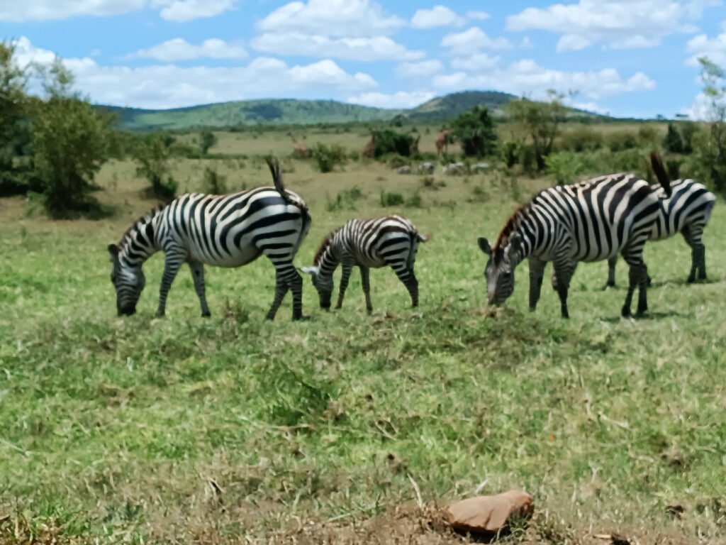 মাসাইমারায় ঢোকার জন্য মোট ছটা দরজা আছে, আমরা ঢুকলাম সেকেনানি গেট দিয়ে। গন্তব্য, আমাদের আগামী কয়েকদিনের বাসস্থান “মাতিরা বুশ ক্যাম্প”। ঘাসজমির বুক চিরে পাথুরে রাস্তা, প্রবল ঝাঁকুনি আর ধুলো খেতে খেতে এগোলাম, এগারোটা বেজে গেছে, মাথার ওপর রোদ্দুরও বেশ চড়া। এর আগে ভারতবর্ষের যে কটা জঙ্গলে গেছি, অনেক ঘোরাঘুরির পর দেখা মিলেছে বনের বাসিন্দাদের, সে বাঘ, হাতী, গন্ডার, যা-ই হোক না কেন। তাই মনের মধ্যে ধারণা জন্মে গেছিল, সাফারিতে বেরিয়ে বেশ খানিকটা ঘোরাঘুরি খোঁজাখুঁজির পরই দেখা মিলবে মাসাইমারার বিখ্যাত “বিগ ফাইভের”, সেই ভুল ভেঙে দিল জেব্রার দল, গেটের কাছেই ঘাসজমিতে তাদের দেখা মিলল। জেব্রা ক্রশিং-এর পর, মানে জেব্রাদের ক্রশ করে একটু এগোবার পরেই দেখা মিলল খানদুই জিরাফের, একটা অ্যাকাশিয়া গাছের মাথাটাকে টেবলটপ বানিয়ে তার ওপর থেকে খাওয়াদাওয়া সারছিল। খাওয়ার ফাঁকে অতিথিদের দিকে তাকিয়ে “পোজ”ও দিয়ে দিল।