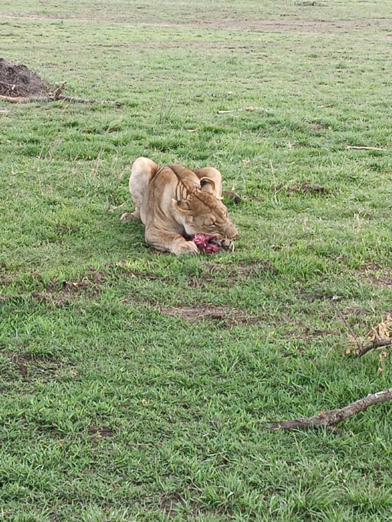 সেদিন দুপুরে ক্যাম্পে ফেরার সময় এক সিংহীকে দেখলাম, একটা ওয়াট হগের বাচ্চাকে সদ্য মেরে সামনে রেখে দিয়ে ঘুমিয়ে আছে। মনে হল, পেট ভর্তি তাই ভবিষ্যতের জন্য খাবার সঞ্চয় করে রেখেছে। ঘন্টা তিনেক বাদে ওই পথে যখন আমরা আবার যাচ্ছি, তখন দেখলাম শিকারী ঘুম থেকে উঠে শিকারের পাশে এসে বসেছে। কয়েকমিনিটের মধ্যে সে খাওয়া শুরু করল, আর সাড়ে চার মিনিটের মধ্যে পুরোটা সাবাড় করে ফেলল। আমাদের এত কাছে বসে খাচ্ছিল যে কড়মড় করে হাড় চিবানোর শব্দ স্পষ্ট শুনতে পেলাম। খারাপ লাগছিল শুয়োরের বাচ্চাটার জন্য, কয়েকঘন্টা আগেও সে ল্যাজ তুলে মায়ের পেছন পেছন দৌড়োচ্ছিল। কিন্তু এটাই খাদ্য-খাদক সম্পর্ক, প্রকৃতির নিয়ম।
